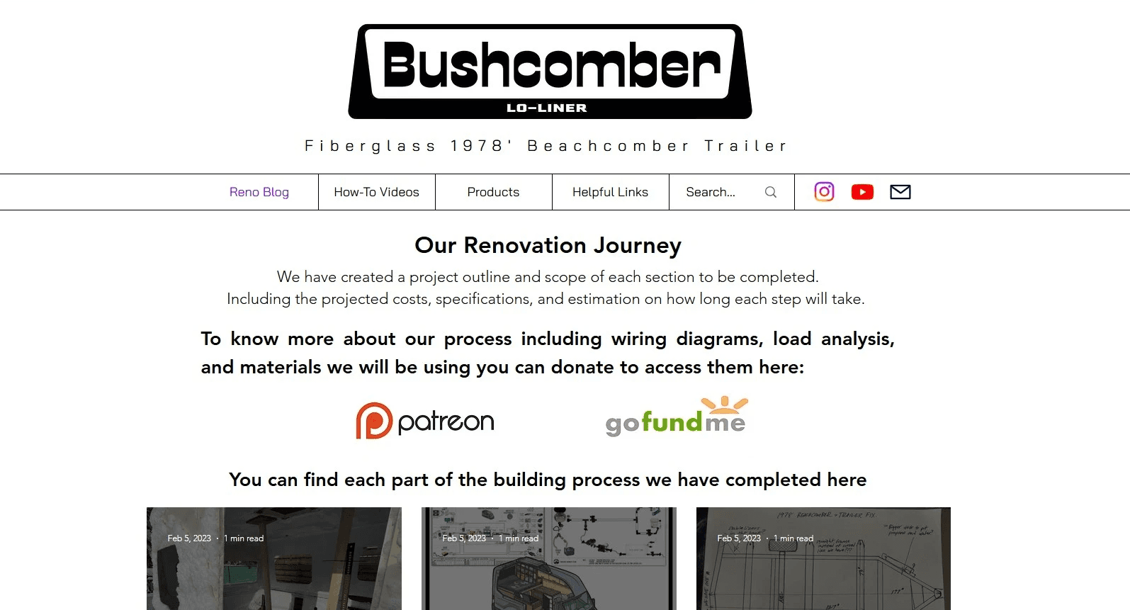 Designed a comprehensive website documenting my renovation journey of a 1978 Beachcomber fiberglass trailer. The site features a chronological renovation blog with detailed posts covering each phase—from the initial purchase through gutting the interior, shell removal, frame work, fiberglass repairs, and interior rebuilding. The website includes dedicated sections for how-to videos, recommended products, and helpful links, plus exclusive access to detailed wiring diagrams, load analyses, and material specifications for donors. The design presents the transformation process in a user-friendly format that helps vintage trailer enthusiasts follow along with the complete restoration journey.