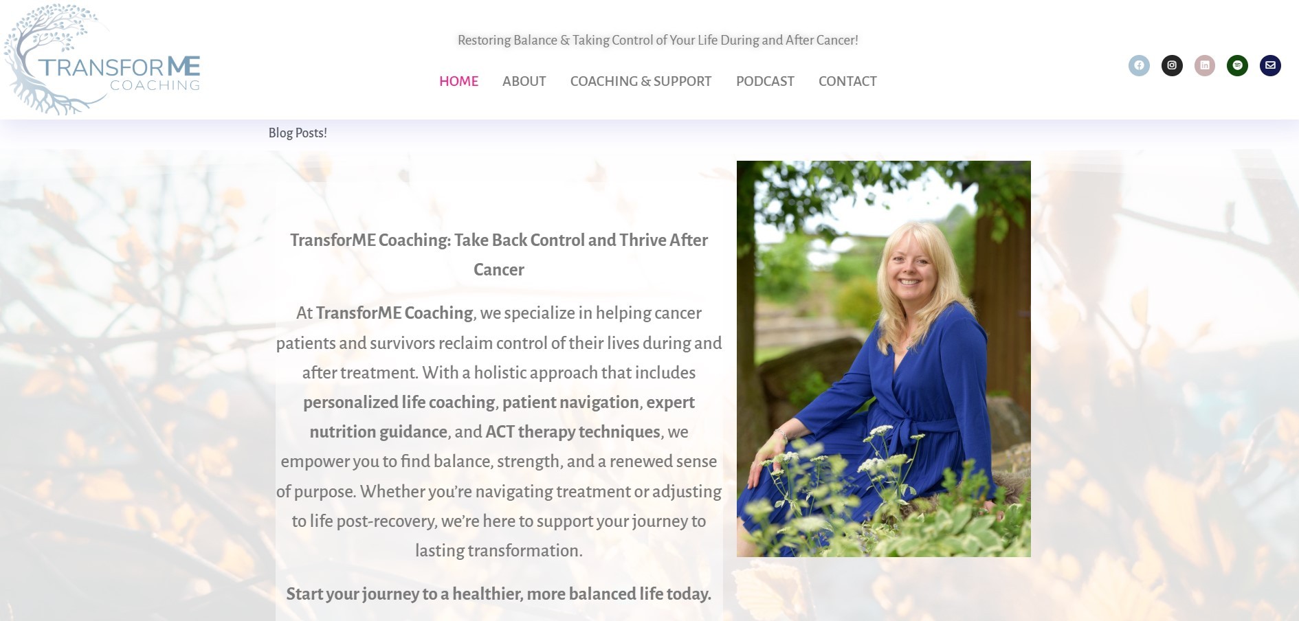I created a website for TransforME Coaching that showcases Tracy's specialized coaching services for cancer patients and survivors. The site features her unique background as both a Registered Nurse and breast cancer survivor, highlights her customizable 90-day programs, includes podcast interviews across multiple platforms, offers easy discovery call booking, and displays compelling client testimonials. The design uses transformation imagery to reinforce her mission of helping clients reclaim control of their lives during and after cancer.