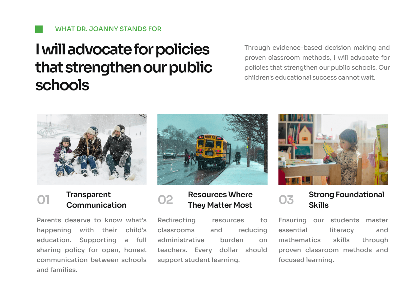 I started by reviewing Dr. Liu's campaign materials, including her 10-minute speech and video scripts. These raw materials needed to be transformed into web-friendly content that would resonate with busy parents, teachers, and community members.