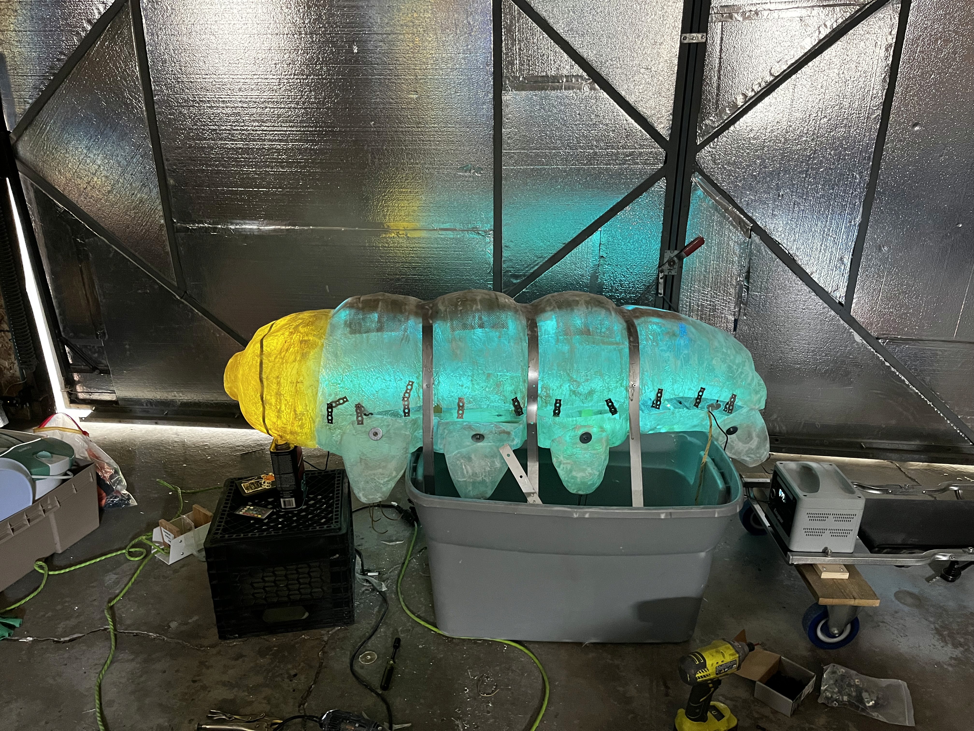 The color-changing capabilities allowed WATERBEAR to shift between ethereal blues, vibrant greens, and warm purples. This illumination made WATERBEAR visible from a considerable distance on the dark playa, serving both as artistic expression and a practical way for our camp members to locate our home base.